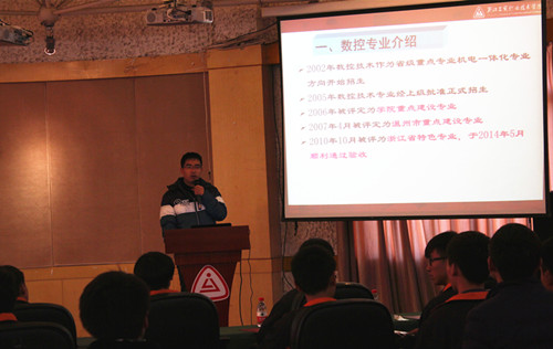 教研室主任李老师则针对专业培养的问题着重跟同学们介绍了分院数控专业的培养方案和课程设置的相关情况,并列举了专业相关各类证书的考试情况,李老师还特意跟同学们讲述了目前数控专业的就业形势,鼓励同学们积极参加学科竞赛。接下来,员工干部上台从自身角度跟大家分享了在校的学习生活、社团活动等经历。
