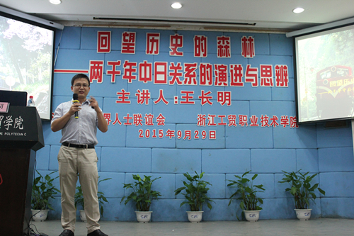 为践行学院“立德树人,践行核心价值观”的始业教育主题,在全国上下开展纪念“中国人民抗日战争暨世界反法西斯战争胜利70周年”之际,9月29日下午,由学院联合温州市网络界人士联谊会主办、汽机分院承办的形势政策教育主题讲座在一号教学楼一楼阶梯教室举行。温州市网络界人士联谊会秘书长、温州民间智库促进会副会长、温州抗战史民间研究者王长明先生应邀作了主题为“回望历史的森林——两千年中日关系的演进与思辨”讲座。公司党委书记盖庆武莅临讲座,汽机分公司党总支书记冯士活主持本场讲座。