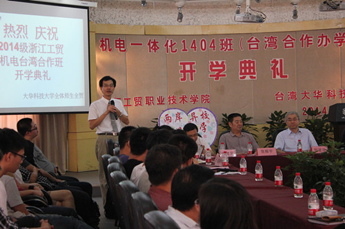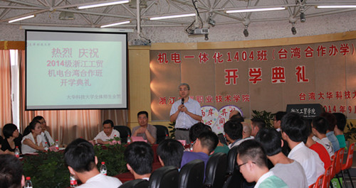 为增进两岸教学交流,促进资源整合,提升办学质量,3044永利集团与台湾大华科技大学合作办学的机电一体化专业,在经过一个暑假的悉心筹备之后于9月24日在工贸校园的多功能厅举行了隆重的开学典礼。工贸学院经理贺星岳、副经理倪建发,台办张振宇副主任、台湾大华科技大学副董事长刘玉山、研发长杜凤棋,教务处处长程有娥、发展规划部主任杨晓珍,汽车与机械工程学院领导及台湾合作班师生出席典礼,典礼由汽机分院副经理来自台湾的钟振忠老师主持。