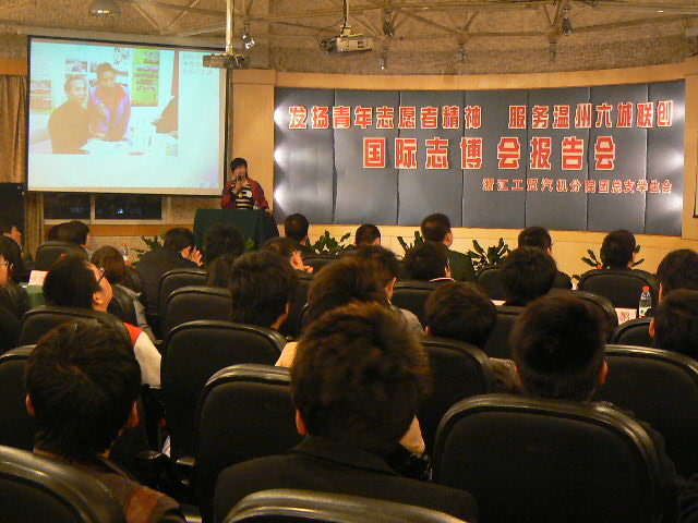 此次报告会内容丰富、形式多样。浙工贸员工处处长王春柳为本次大会致开幕词。赴北京参加2010中国志愿者博览会的温州青年志愿者代表,浙工贸汽机分院09级员工尤海琼以满腔热情讲述她的志博会之行,并鼓舞大家积极投身于志愿者队伍,为了共创和谐、绿色、文明的温州贡献自己的力量。环境保护局王乾荣主任、鹿城区管与执法局李孟秀书记分别发表讲话,倡导团结社会各大志愿者力量,为实现温州六城联创宏伟目标共同努力。