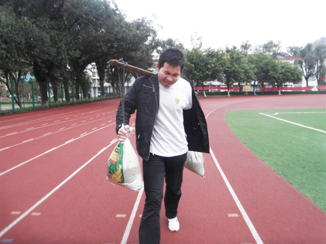 首先是个人赛挑沙包比赛,象征着父亲的生活重担。比赛规则是每个人都认为挑着沙包绕操场跑一圈并不是很难,可在试了以后才感觉到是多么的不容易,班长说了一句话:“我们汽机系个个都是男子汉,这点累跟自己父母的累比起来,真的是九牛一毛。接下来的团队赛更是精彩,有同学提议他们自己组队,所以同学们各自组了自己的队伍。比赛采取接力形式,更是一种团队合作,也是一种勇敢的象征,每次一个选手跑到的时候另一个选手马上接过他手种的扁担,放在自己的肩膀上,似乎在说:“哥们,你休息下,我上。”精彩的比赛,热烈的加油声,最终的冠军花落谁家呢?当数控0801的参赛选手获得冠军的时候,所有人都以热烈的掌声送给了他们,也仿佛在说:“数控0801好样的”。