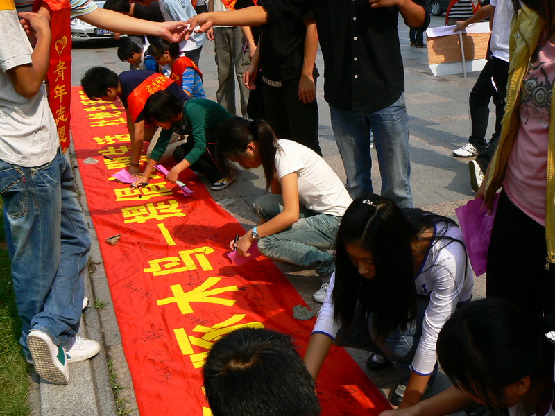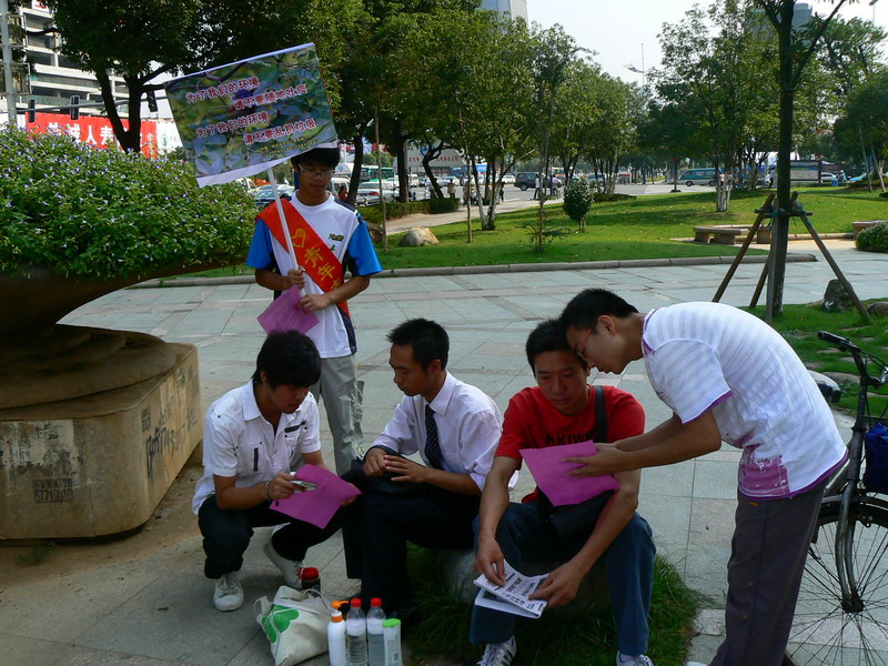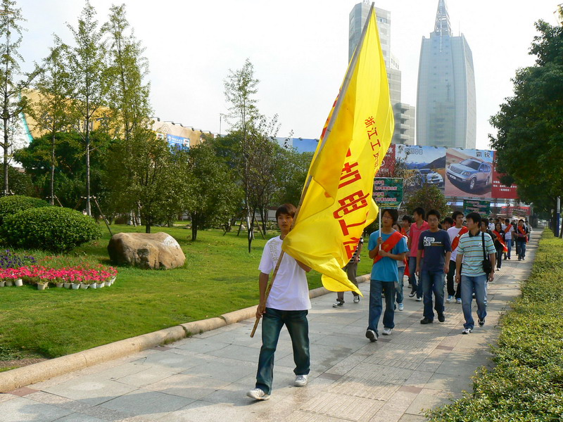 2008年10月19日早上8点30,志愿者身披志愿者披肩,胸戴啄木鸟活动标记,手举提倡环保生活的标语,在汽机系系旗的下集合。8:40,我们准时出发,一路上志愿者蓬勃的朝气,良好的精神风貌收到路人的注目,充分体现工贸学子风采。