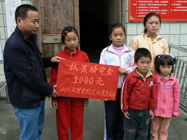 在此之前,我们了解到村里有几位家庭十分贫困的员工,他们学习成绩优异。我系党员就自发捐款,这次党支部带着全体党员的爱心,代表全体党员向5位贫困员工捐款1000元,希望他们好好学习,健康成长成才。我系党支部还将继续关注帮助这些贫困员工。在现场,我们与一位家庭贫困的聋哑女孩聊天,交流的方式是文字。女孩非常开朗、乐观,一直微笑着面对我们。当我们伸出大拇指夸她字写的好时,她非常开心,还用手势表达着“谢谢”“我爱你们”等。