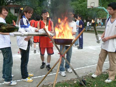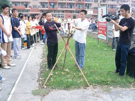 随着各站点裁判员各就各位,章迪康老师一声令下,各参赛队员以迅雷不及掩耳之势冲出了起跑线。现场围观的同学也一直为我们的队员呐喊、加油。整个校园欢呼声、喝彩声连绵不断------参赛队员在比赛中体会到了当年红军长征的艰辛历程,也充分发扬了奋力拼搏的奥运精神。