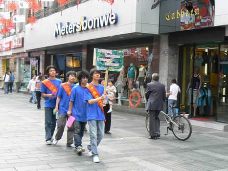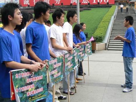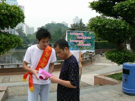 从四月21号开始至今,我们已经开展了三次绿色啄木鸟行动。绿色啄木鸟行动最先由北京的志愿者王先生在去年五月份发起,同时他还建立了一个名为“绿色啄木鸟禁痰网”的网站宣传禁痰知识,希望有更多的人加入到绿色啄木鸟的行列中来。今天的活动是在北京、成都、温州三地联合同时开展。