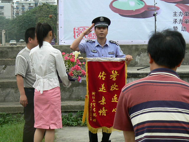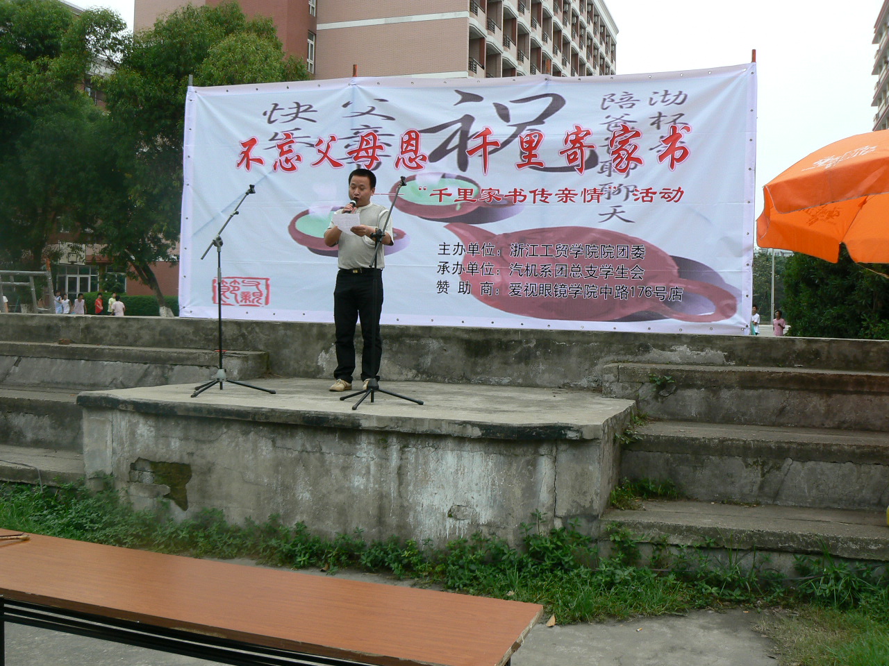 本次活动由朱献富同学发起,院团委主办,汽机系团总支员工会承办。参加此次活动的有员工处处长潘毅老师、院团委书记王春柳老师、汽机系书记章迪康老师、汽机系主任石品德老师、汽机系部分老师及公司160多名同学。此外,还特邀了2006年感动温州十大人物之一 ——五马派出所董祥笔警官和爱视眼镜学院中路176号店负责人林晓琳女士参加。