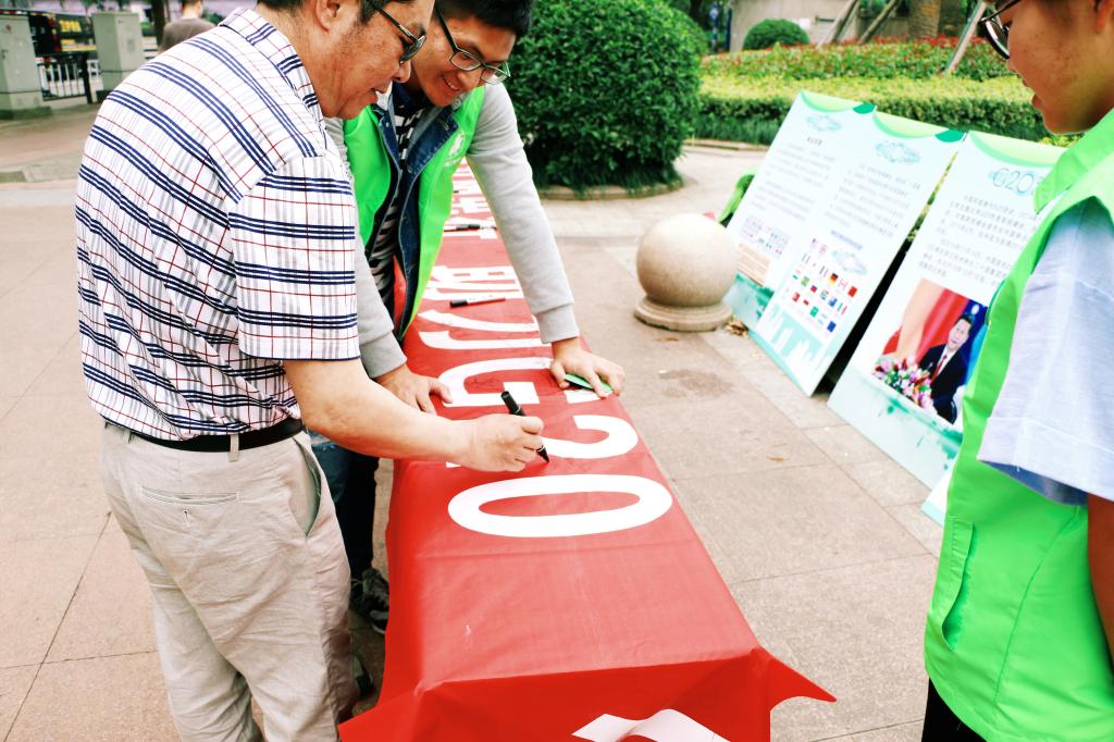活动内容主要有文明出行交通劝导及G20峰会小知识介绍。志愿者在鹿城区物华天宝的环形路口人行道红灯等候区进行劝导活动,劝导为赶时间而想要闯红灯的行人,并帮助老年人和带小孩过马路的家长顺利通过人行道。在宣讲处,志愿者们摆放G20峰会知识宣传板块并为不了解G20峰会的社区居民们讲解相关新闻和知识。路人们为志愿者们的行为纷纷点赞,并且还在活动主题横幅上面签下了自己的名字,以此表示对公司交通劝导公益活动的支持、对G20峰会开展的助力。