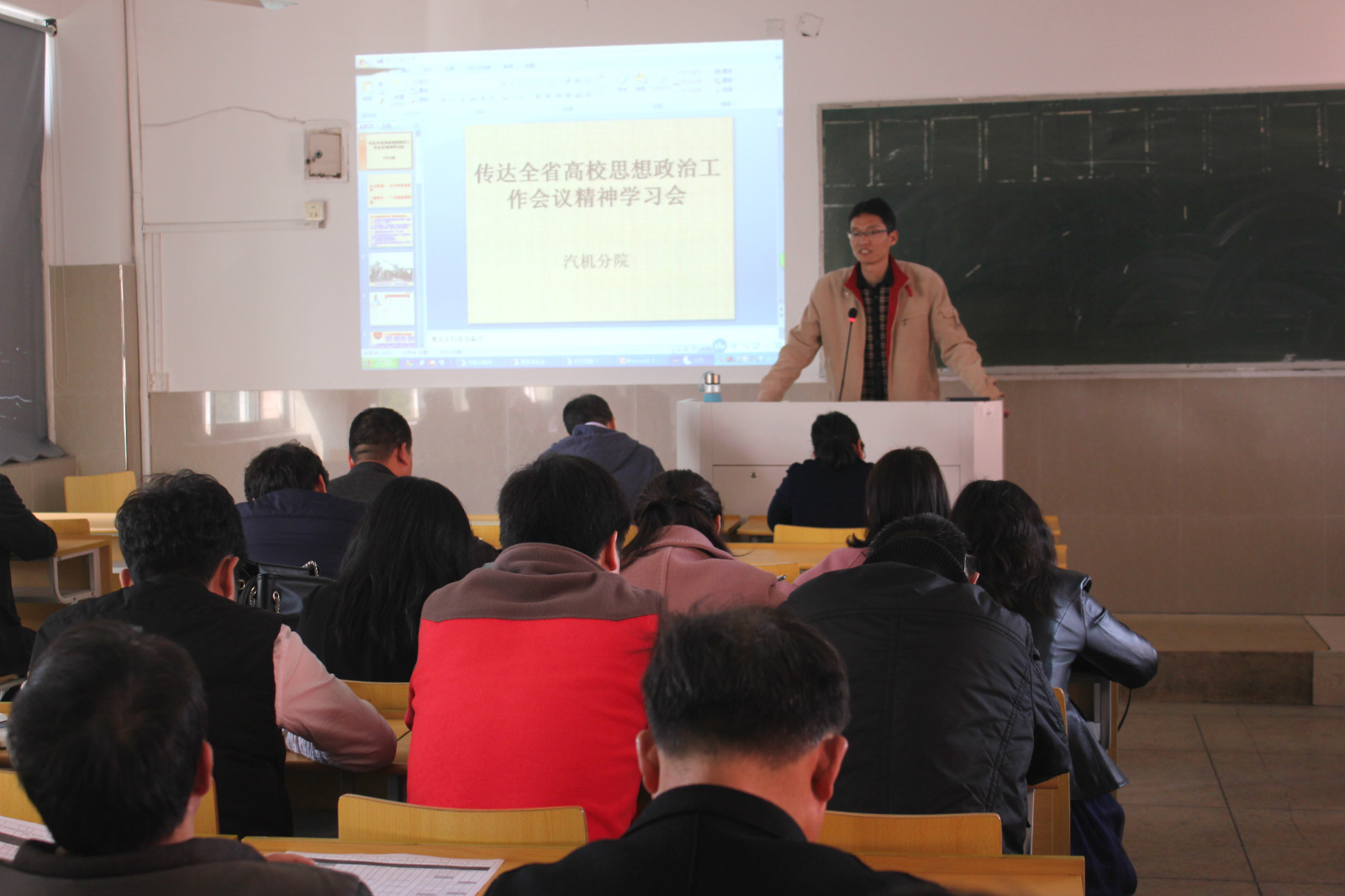 首先,分院书记吴学亮老师传达了省教工委关于迅速“学习贯彻全省高校思想政治工作会议”精神的通知,强调了此次学习的重要意义,要求全体教师在思想上引起高度重视。根据上级领导要求,要认真学习贯彻习近平总书记系列讲话、浙江省高校思想政治工作会议精神和夏宝龙书记的重要讲话,把立德树人作为高校的立身之本;学习夏宝龙书记关于“高校十要”的论述是当前做好公司思想政治工作的重要遵循;要坚持把会议精神和分院思想政治工作相结合。吴书记提到,作为高校教育工作者,我们要自觉践行“四有”、“四个引路人”和“四个相统一”的要求,做员工成才成长路上的指导者和引路人。