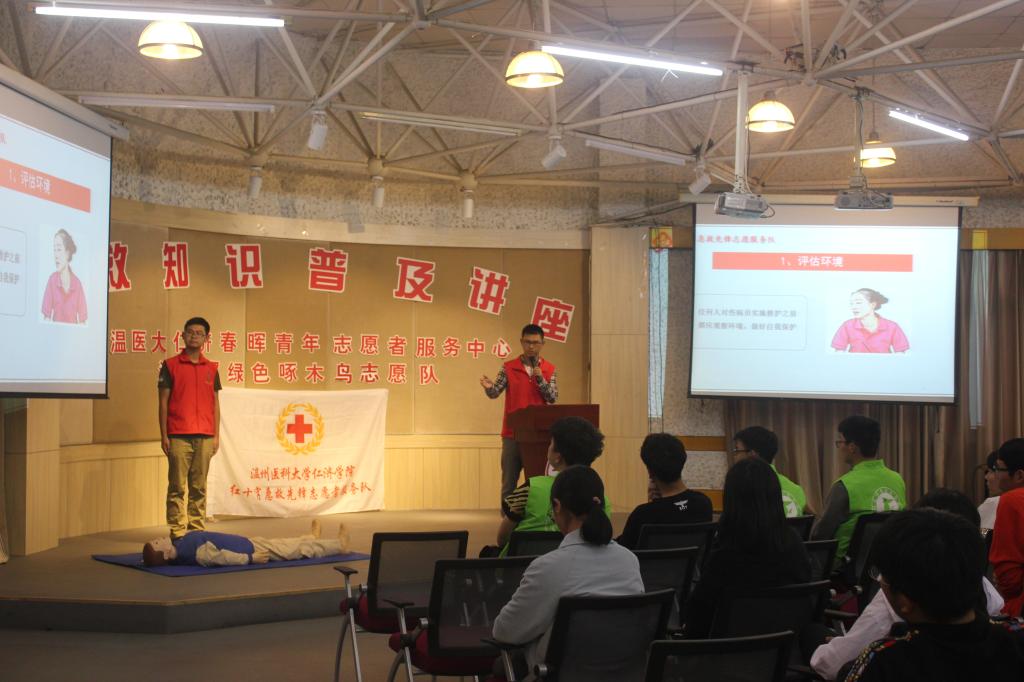 绿色啄木鸟志愿队为此邀请了温医大仁济春晖志愿者服务中心的志愿者前来给我们培训。志愿者们先是给我们看了“最伟大的心脏”急救视频,视频中记录了一些急救视频,在患者命悬一线的时候,急救人员挺身而出,通过自己所掌握的急救知识,把患者从死神的手中夺了回来,看得我们仿佛亲身经历一样,在为病人担心的同时还对急救人员十分佩服,他们就像是天使一样,救助需要帮助的人,十分劳累辛苦却没有什么怨言,无私奉献,这也是我们志愿者的精神。