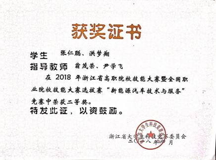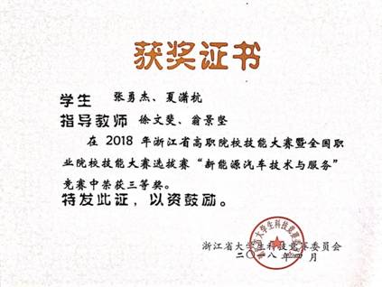 4月13-14日,2018年浙江省高职院校技能大赛“新能源汽车技术与服务”竞赛在浙江交通职业技术学院举办,汽机分院汽修专业翁茂荣、尹学飞、徐文斐、翁景坚四位老师指导两只队伍在竞赛中沉着冷静,表现出色,在参加省赛的27支队伍里,一支队伍获第四名(二等奖)的好成绩,另一支队伍获第九名(三等奖)的好成绩。
