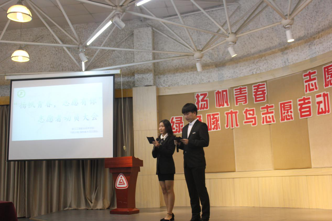 动员大会由分院团总支员工会实践部部长助理沈思远和干事陆思敏主持。首先,由志愿者刘鑫介绍了绿色啄木鸟志愿队的历程,从在北京建立志愿队到成立绿色啄木鸟志愿队温州分部并落户浙工贸,讲述了绿色啄木鸟所走过的十年历程;分享绿色啄木鸟志愿队过去一年的活动点滴和剪影;并谈及绿色啄木鸟2018-2019学年的活动规划。通过介绍,希望在场的新志愿者们了解啄木鸟志愿者。