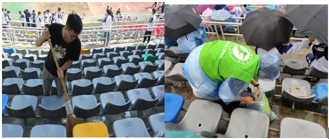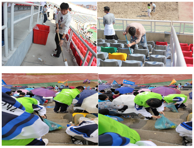 运动会期间,绿色啄木鸟志愿者们换上了志愿服,开始穿梭在体育馆上汽机分院观众席的各个角落,捡拾落在地上的垃圾,为同学们营造一个干净的观看场地。同时,志愿者们也做好倡导工作,提醒汽机学子,文明观看,保持场地卫生。除了观众台,志愿者们也在体育馆内场忙碌,做好比赛的后勤工作。志愿者们为运动员拿衣物、在终点场服务运动员,或是给运动员递上食物和姜茶等等。运动会结束后,面对堆积如山的垃圾,志愿者们留下来清理场地,他们默默地整理着,传递出一种奉献、友爱、互助、进步的志愿精神。