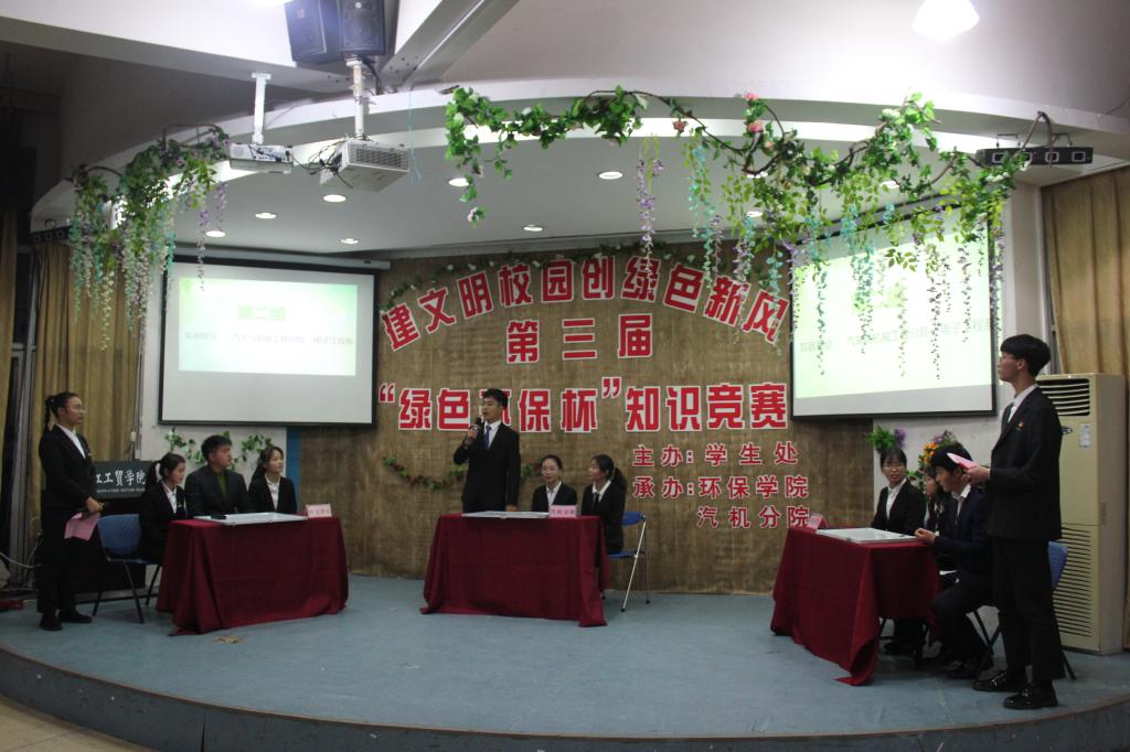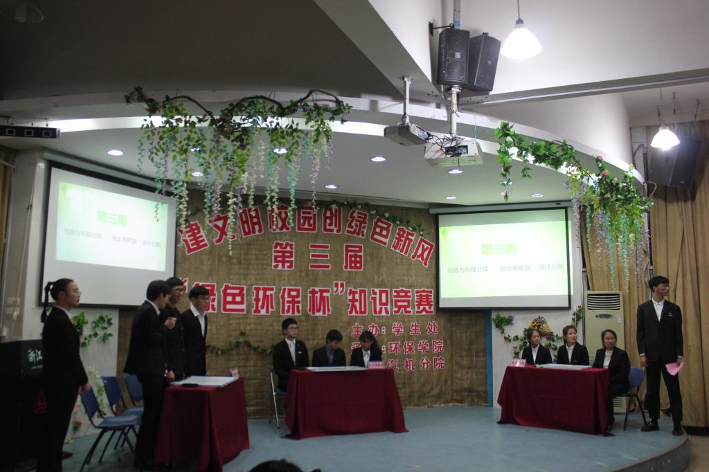经过前期的笔试选拔,共有七个二级分院系和两个社团组织进入现场答题环节,他们分别是经贸分院、管理分院、汽机分院、信息分院、设计分院、材料系、电子系、院宿管会以及创业者联盟。比赛环节分为初露锋芒、崭露头角、携手共进、绝地反击四个环节。第一环节为必答题,各参赛队伍均回答10道题,淘汰分数较低者。第二环节-崭露头角为抢答题,各参赛队伍全神贯注,积极答题,赛事中弥漫着紧张的氛围。在第二轮淘汰两只队伍后,共有6支队伍进入较为刺激的第三轮,该环节共设置了36个方格,各队伍随机抽取不同分值的题目甚至是零分的炸弹。活动中,既有抽中高分值题目且答对而高兴的队员,也有因为抽到炸弹而失望的队员。最后,经贸分院、管理分院、汽机分院和宿管会进入了第四关--绝地反击。此关根据题目难度设置为20分、30分和40分,答错将加减想赢分,这是本场比赛悬念最高的环节。通过好几轮角逐,最终经贸分院荣获第一名,院宿管第二名、汽机分院第三名以及管理分院优胜奖。在整场比赛中,为了让更多的人掌握环节知识,中场游戏设置了现场观众参与的环保知识问答以及专业主任郑晓茶老师的环保知识窍门分享。