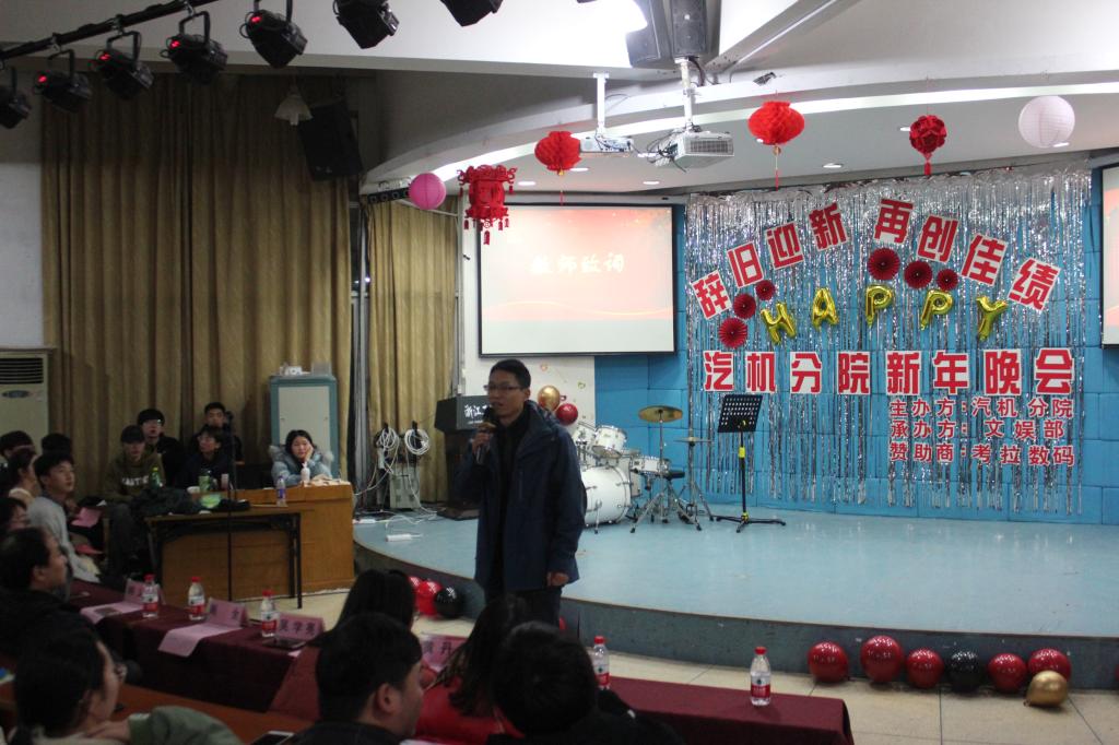 活动最后,分院书记吴学亮老师做新年致辞,先感谢今晚为晚会付出的各位同学,接着是希望新年里同学们要树立明确的目标,从认真对待期末考,到好好利用寒假生活,给个人多方面充电,最后是要重新审视自己,让个人在2019新年里再创佳绩。