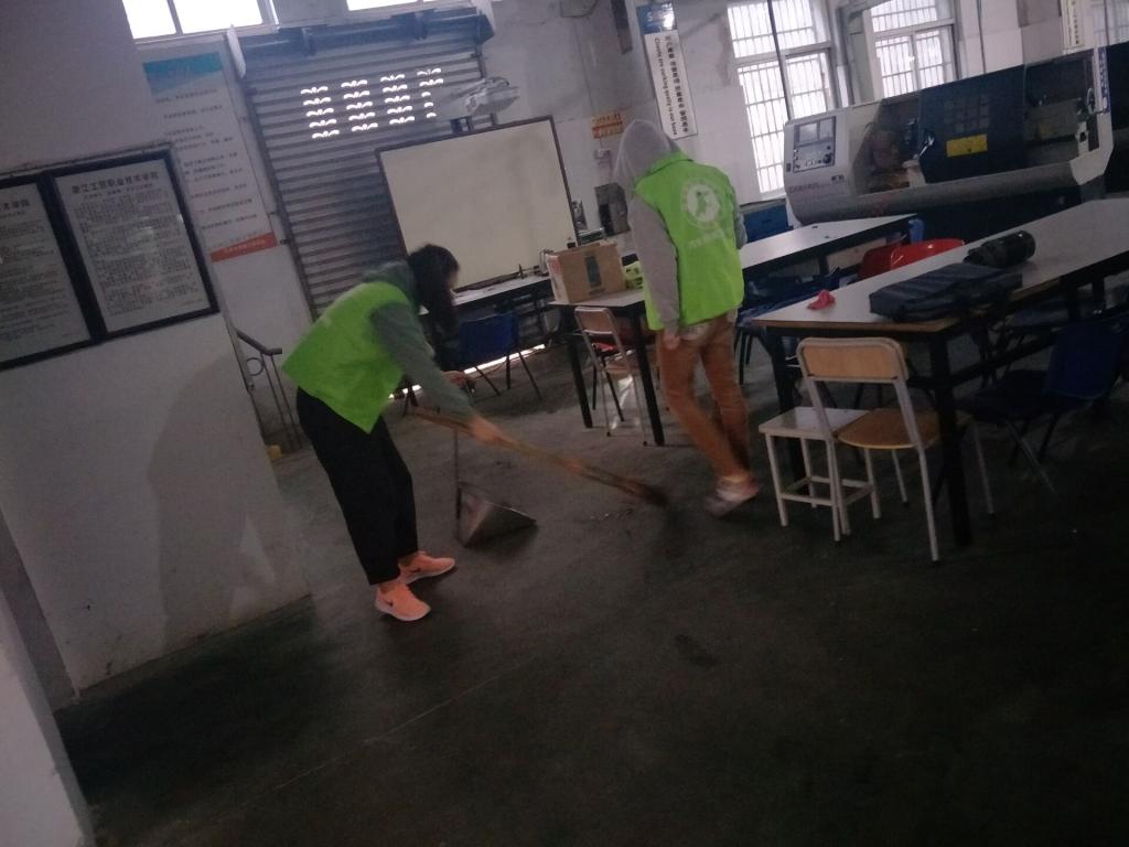 当日下午三点,志愿者们身着绿色啄木鸟志愿服在数控车间集合,由负责人分工安排,对数控车间和新能源实训中心的地面进行垃圾清扫活动。顿时,车间的各个角落出现了志愿者们忙碌的身影。在打扫过程中,志愿者们分工明确,又相互配合、相互帮助,很好地发挥了不怕累、不怕脏的精神,展示了崇高的志愿者精神。虽然清扫车间的工作很累,也很脏,但是志愿者们都很开心地、尽心地参与到此次活动中,因为这是一件十分有意义的事。