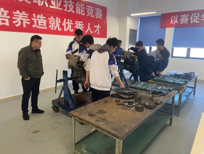 比赛前,后勤人员在老师的带领下将会场布置完整。此次比赛的题目为选手利用指针式扭力扳手、棘轮扳手、套筒、锤子等工具将配气机构的气门传动组和曲柄连杆机构的活塞连杆组和机体组拆卸并组装形成润滑系统。在比赛开始时,评委老师会问他们一些理论知识,这使赛题内容更加全面、专业程度更高,以及更加考验参赛人员的专业知识与技能。