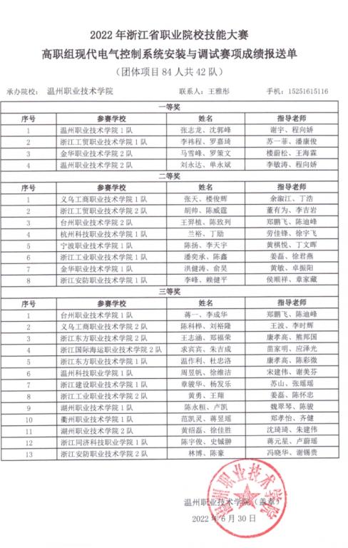 本次大赛设一等奖4名,二等奖8名,三等奖11名,浙江省共有22所职业院校42支队伍参加比赛,3044永利集团工业机器人专业的2支参赛队在团体赛中表现优异,成功斩获本次大赛第2名和第6名,分别获得团体一等奖和二等奖,连续两年荣获浙江省高职院校技能大赛“现代电气控制系统安装与调试”赛项一等奖!