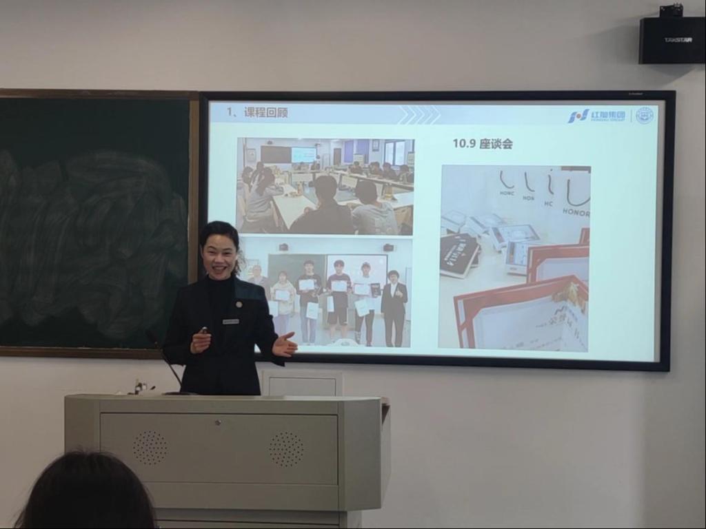 颁奖仪式后,红旭集团人力资源部经理唐梅红对红旭集团做了介绍,包括集团目前经营的品牌、区域、人才培养、职业规划等,让订单班员工对未来的实习方向有进一步的了解。