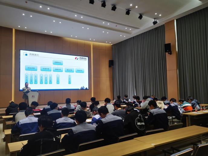 奔腾激光唐爱敏主任、人事部周赛娟部长、张耀清、王肖儒等热情迎接师生的到来。唐爱敏主任带员工参观介绍了企业展厅、远程运维中心、研发车间、生产车间、食堂、宿舍及活动娱乐场所,现场展示了最新的磁悬浮床身高速激光切割技术。周部长在报告厅给员工介绍了岗位工作内容、岗位晋升路径、公司福利待遇等。