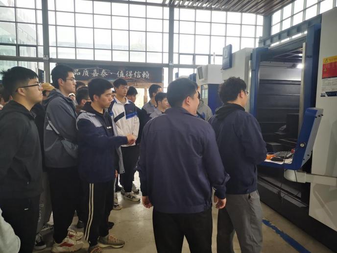 奔腾激光参观结束后,来到嘉泰激光,嘉泰激光人事部张倩经理、售后部陈庆喜主管、徐敏绎副主管等接待了师生。企业给员工现场展示了激光切管、高功率激光切割厚板等。