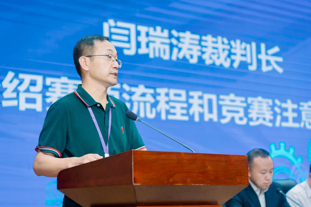 闫瑞涛裁判长针对报道抽签、设备准备、实践操作、应急处理等14个方面对赛项流程和竞赛注意事项进行了详细地说明,并强调各参赛队伍要严格遵守比赛纪律,裁判团队将会按照规则严肃执裁,确保比赛公平公正。