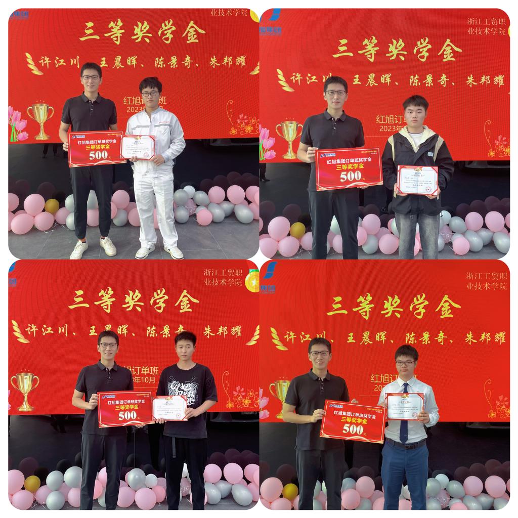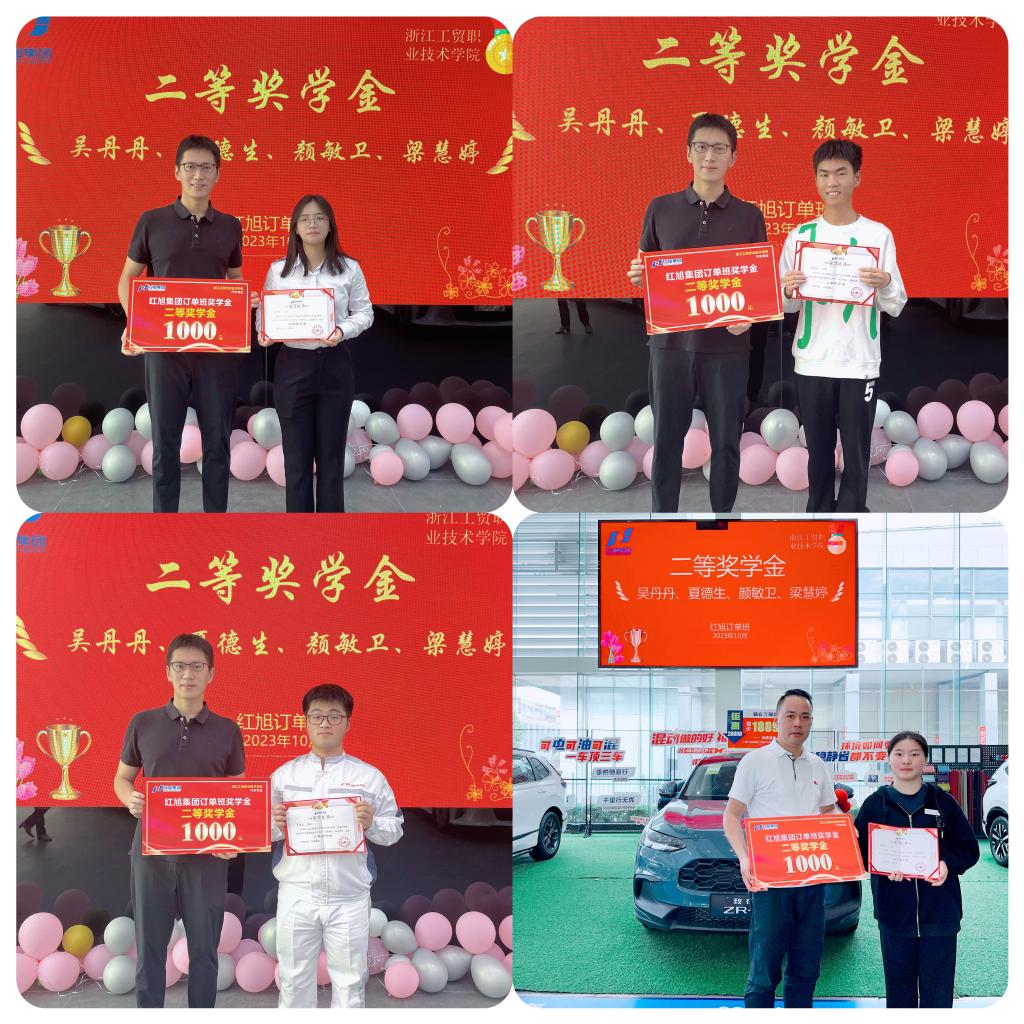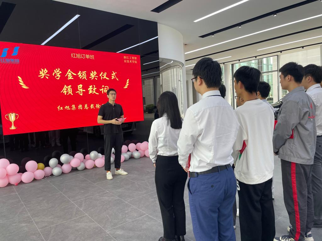 颁奖仪式有唐梅红主持,结合红旭订单班员工课程出勤、课堂表现、在品牌店实训期间表现、暗访汽车品牌店的总结报告及实习工作表现进行了综合评选和排名。分别评选出一等奖奖学金2名、二等奖学金4名、三等奖学金4名。红旭集团总裁徐程胜依次为每位获奖同学颁奖。
