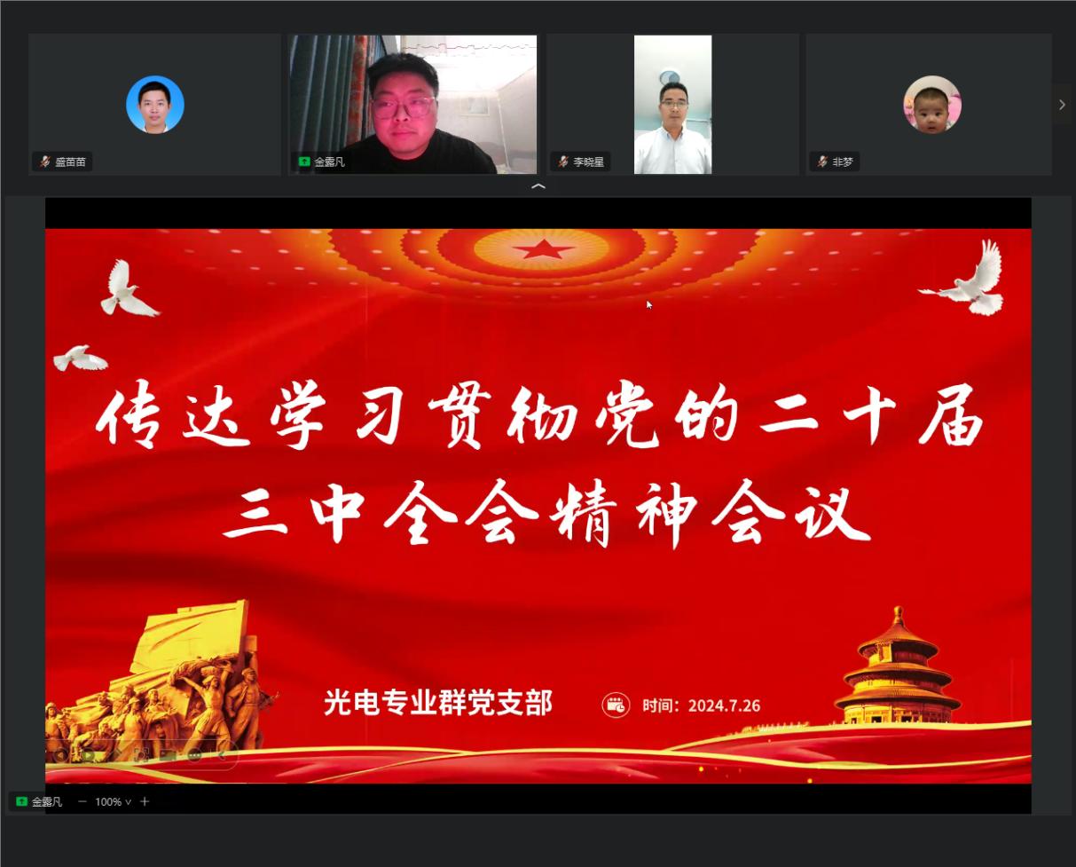 在会议精神的引领下,7月26日光电专业群支部开展“传达贯学习彻党的二十届三中全会精神” 专题线上学习会,会议由支部副书记金露凡主持,专业群支部全体党员参加。公司党总支书记李晓星发表讲话。