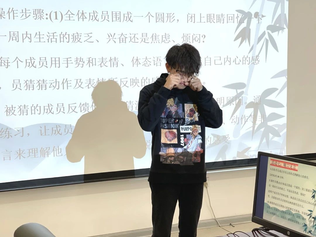 在游戏结束后,同学们讲述着开学几个月以来的人际交往经历,那些有关于宿舍习惯不同、有班级工作对接、有如何和老师沟通的问题,以及初次离开家来到陌生地方的局促不安感,在这场培训中逐渐消除。最后,章老师由衷地说道:“希望大家可以有一个健康的人际交往关系。”最后,章老师由衷地表示:“希望大家都能拥有健康的人际交往关系。