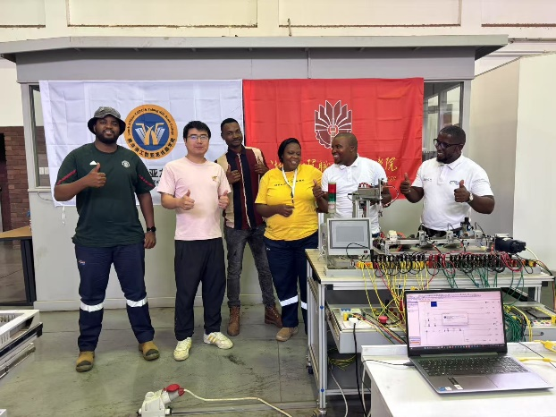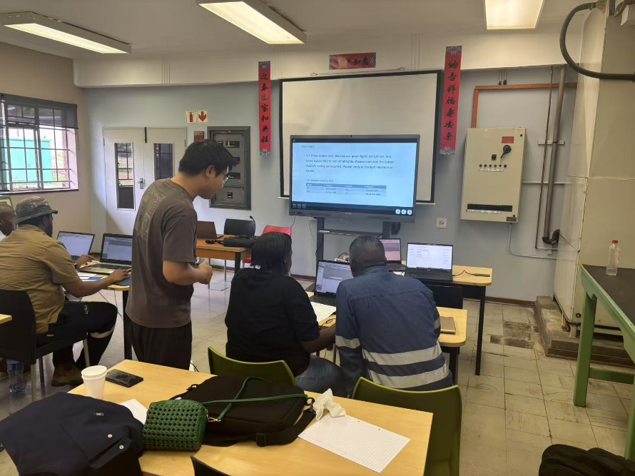 近日,学校应南非高等教育培训部(DHET)、南非中国文化和国际教育交流中心(CCIEEC)的特别邀请,承接了由南非高教部组织的“2025年南非高职院校教师PLC自动化系统开发”(PLC Automation Systems developmental Training)。学校委派“南非浙工贸亚龙丝路学院(筹)”专任教师李俊达前往位于约翰内斯堡的高教部英德拉技术测试中心为9名北开普城市职业技术教育学院专业教师进行2月10日-14日为期5天的培训,培训内容包括PLC基本操作、人机交互界面设计、自动化生产线操作等方面,一场跨越万里飘洋过海的技术援助和文化交流正随着丝路之缘欣然展开。
