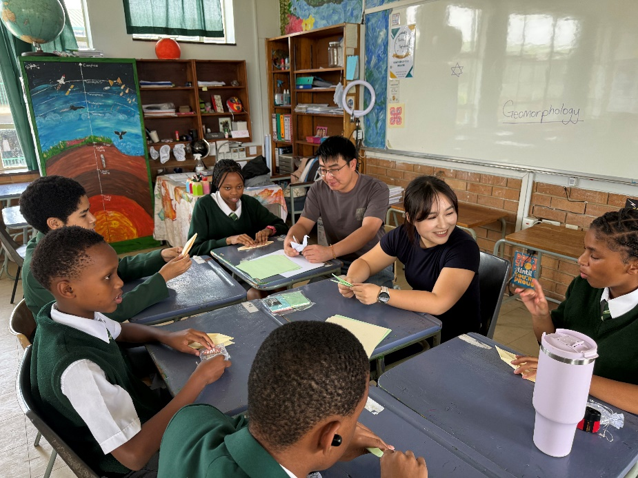 在Glen High School(Pretoria),李俊达老师在与员工们的交流环节中,介绍了中国悠久的历史文化、灿烂的传统艺术以及先进的教育体系,引发了员工们的强烈兴趣,大家纷纷踊跃提问,现场气氛十分热烈。为了让员工们更直观地感受中国文化的独特魅力,李老师现场进行了折纸鹤的教学活动。在李老师的耐心指导下,员工们逐渐掌握了折纸鹤的技巧,当他们成功地折出自己的纸鹤时,脸上洋溢着满满的成就感和喜悦之情。