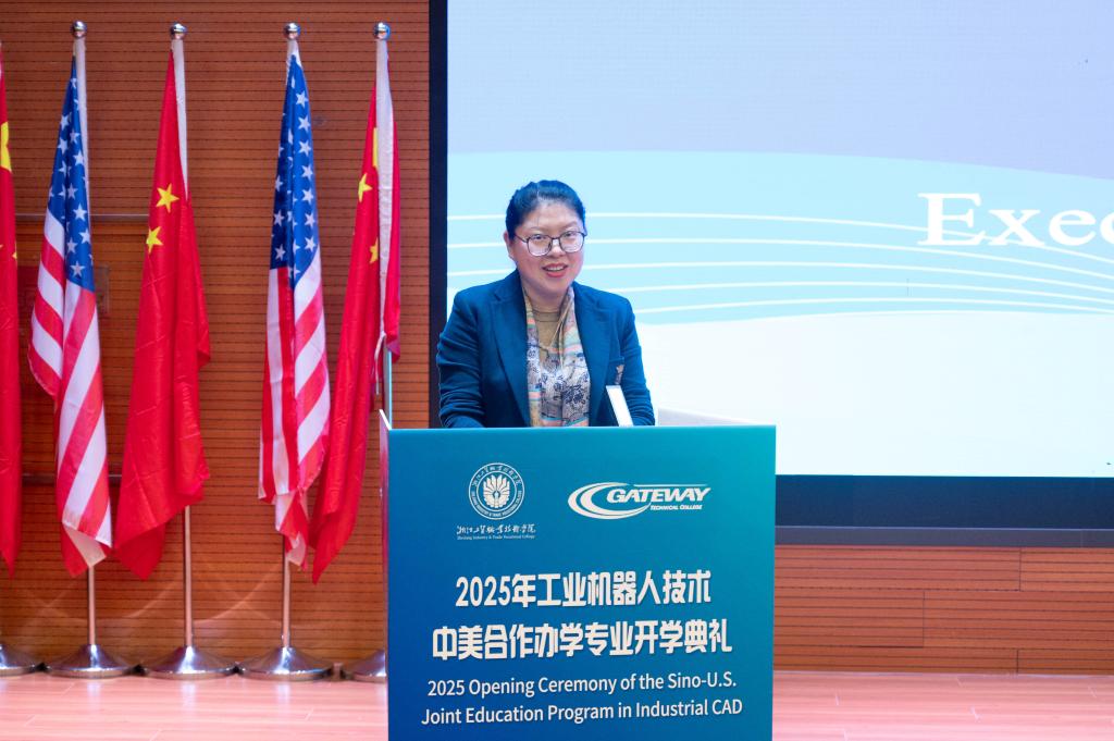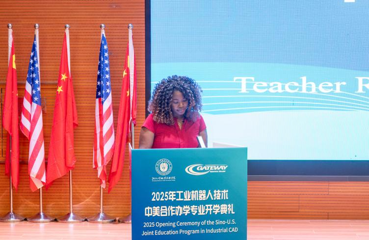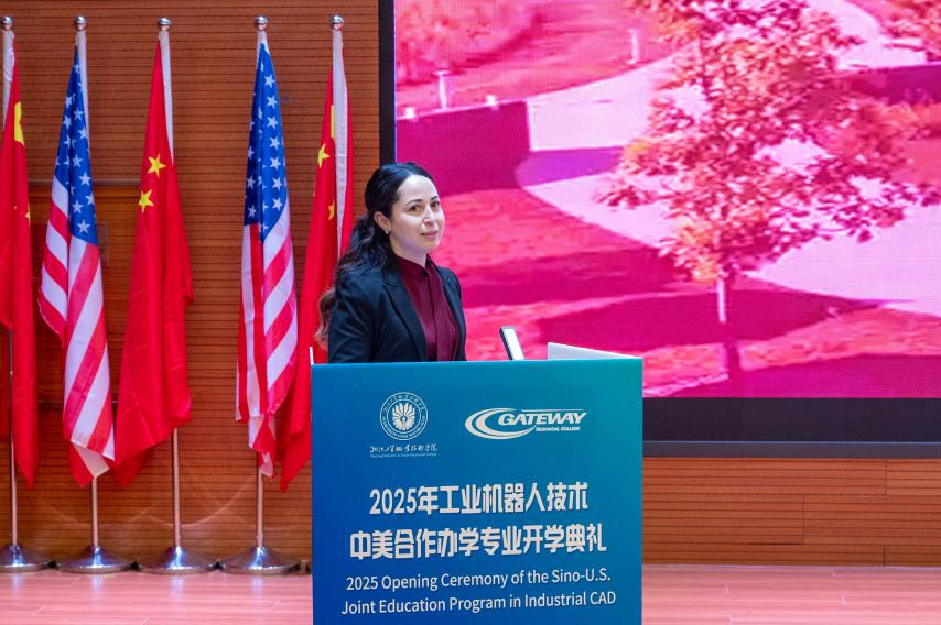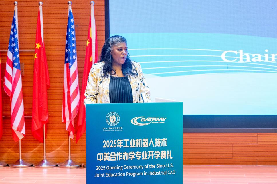 然后,由美国盖特威技术学院Demeetrise Trishele Ford副董事长致辞。Ford女士肯定了中美合作办学项目在课程体系、团队力量与国际认证方面的独特优势,凸显了“技术+人文”双核驱动的培养理念。