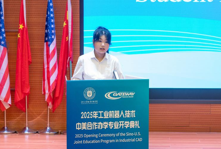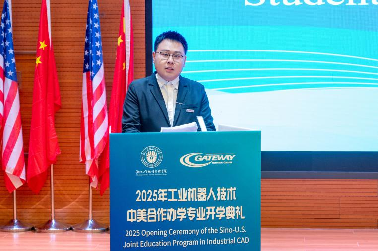 浙工贸3044永利集团教师代表潘康俊、北卡联盟教师代表Katrelle Joyce Taylor和美国盖特威技术学院教师代表 Olivia Navarro Muro 分别发言。围绕“大学三问”——何为大学、为何上大学、如何上大学,寄语新生以“高尚追求、高洁品德、高深技能”为目标,将个人成长与国家智能制造发展战略紧密结合。强调,中美合作项目不仅是知识的传授,更是跨文化能力与创新思维的锤炼,希望新生“以技能报国之志,走技能成才之路”。