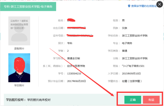 2、“学信档案”注册后,登录点击“学信档案”查看“学籍信息(图像校对)”,并点击“照片正确”,信息才能核对成功;如提示查无此生学籍信息,请联系教务(0577-88332960);