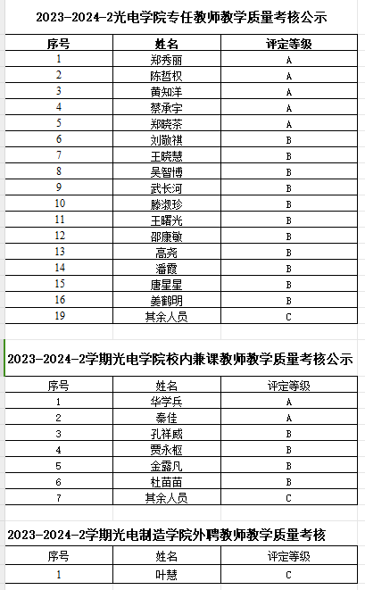 2023-2024-2学期光电学院教师教学质量考核名单公示如下:专任教师 A等5人,B等11人,校内兼课老师 A等2人,B等4人。公示时间:2024年7月9日-2024年7月11日,共3天。