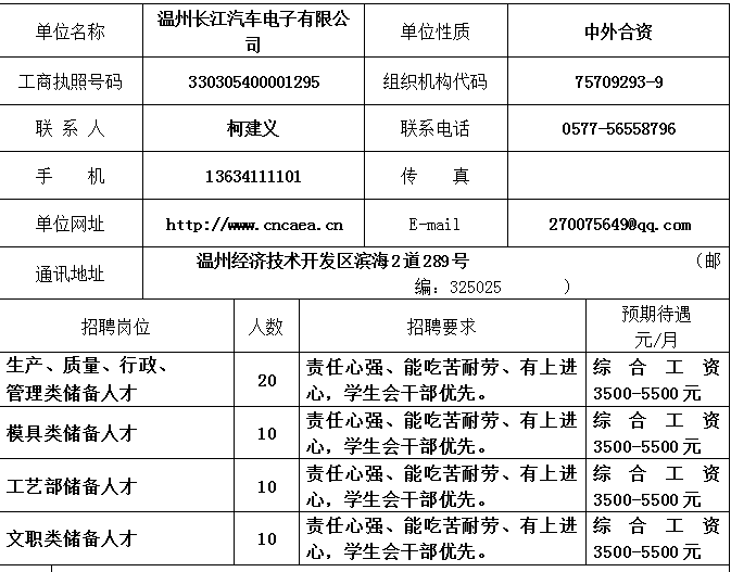 温州长江汽车电子有限公司招聘