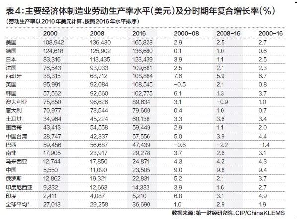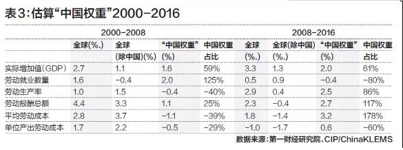 若以金融危机前后来区分“中国权重”,从2000年到2008年,全球制造业增加值以每年平均2.7%的速度增长,其中60%来自就业增长的贡献,中国不仅是全球就业增长的唯一源泉,还补偿了其他经济体就业的净减少。在2000-2008年,中国大规模就业增长将全球制造业的劳动报酬总额推高了三分之一,但也使全球制造业平均劳动成本降低了四分之一。