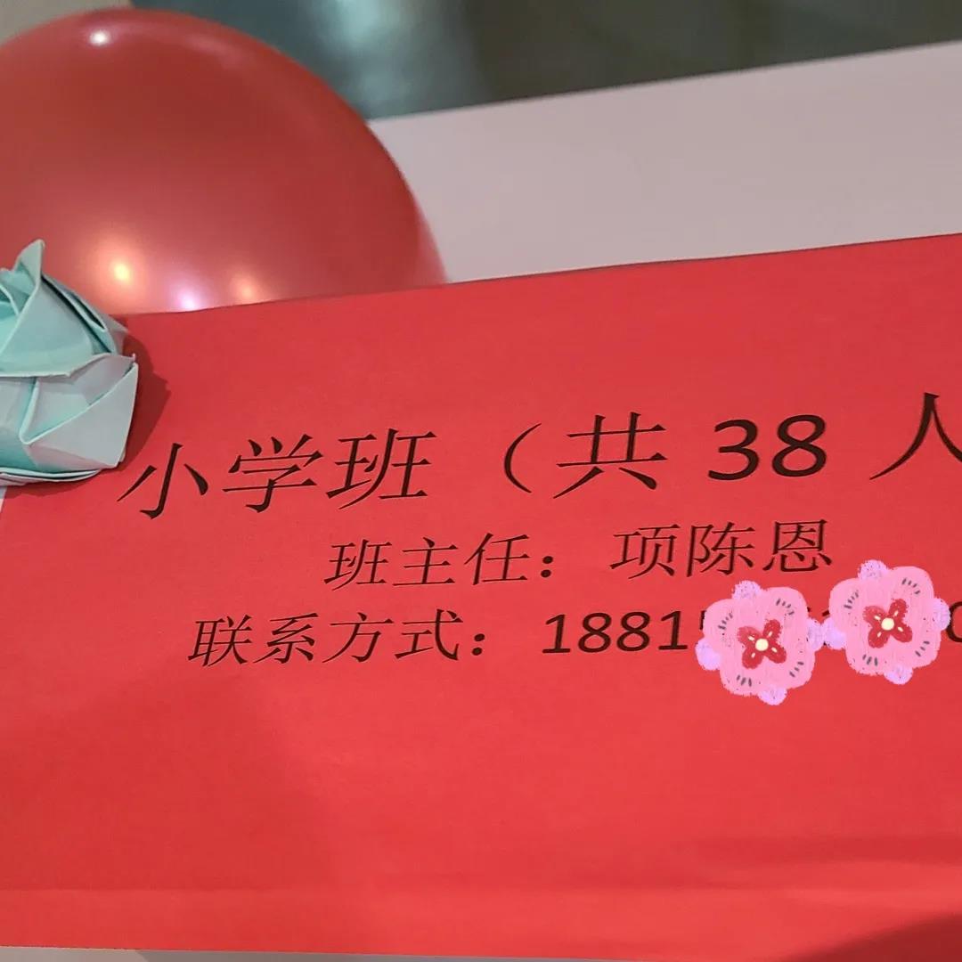 本次爱心支教的两个班级:幼儿班、小学班的班主任一职均由队员们承担,小学班班主任:项陈恩同学,幼儿班班主任:许詹成同学。他们不仅负责上课和看顾小朋友们还要负责和家长们对接,及时将小朋友们的状态汇报给家长,可谓责任重大。下图为两位班主任的“名片”,值得注意的是,名片旁边放着的用纸折的花朵是送给小朋友们的暖心礼物,同时也是哄幼儿班小朋友们开心的宝物~