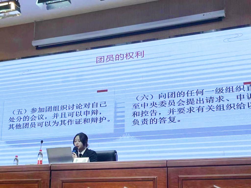 第五期团课由李潇同学担任主讲人,李潇同学为大家讲述了共青团的组织架构与共青团员的权利和义务,在进一步了解共青团的同时,大家也充分认识到作为一名共青团员所肩负的职责之重。