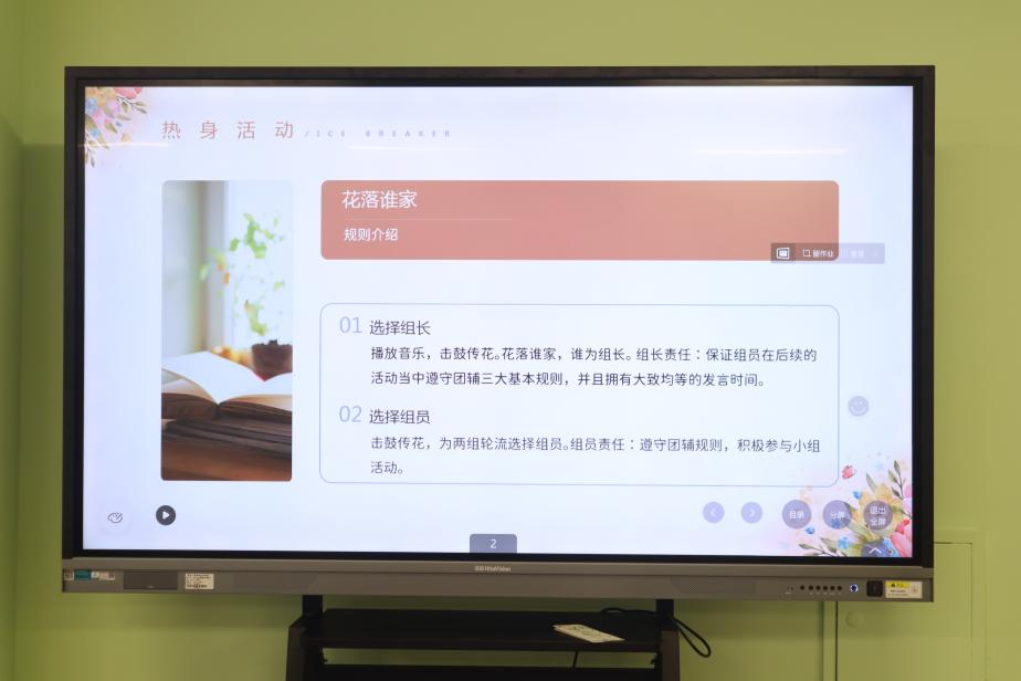 在最后一次团体辅导中,王老师再次强调了团辅的三大基本准则:保密,真诚,接纳。她通过热身游戏热络现场的氛围,并且引出情绪动机标尺的概念,通过“花落谁家”将在场同学机平均分成两组,并由最初选出的两位同学担任小组组长,老师协同小组长共同解决小组成员的困惑。