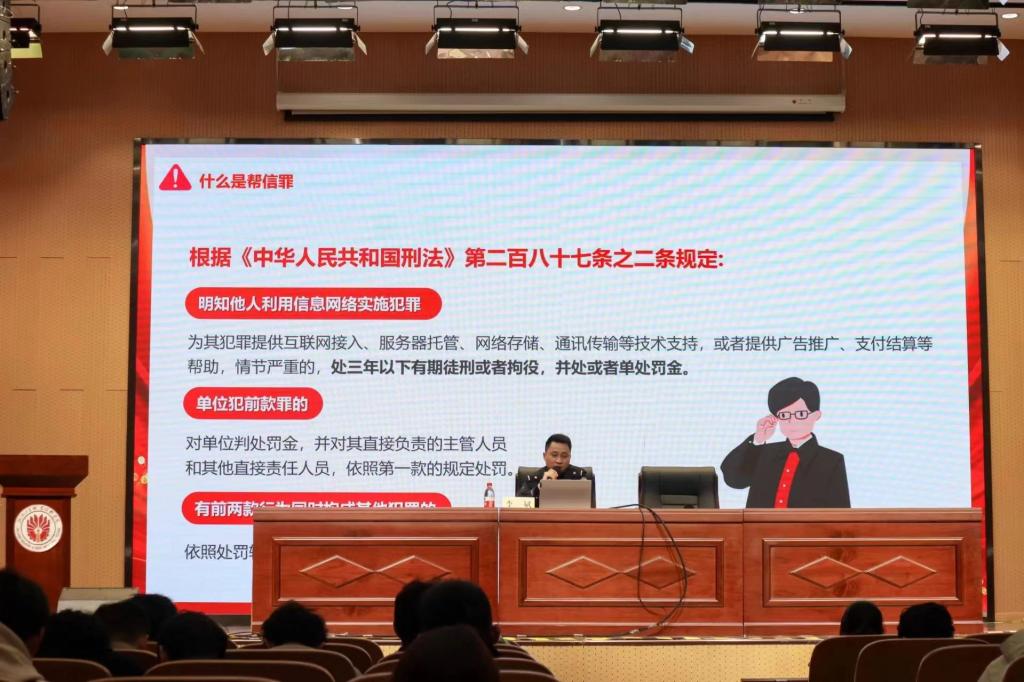 接下来,李斌警官就本次法治教育主题,围绕电信诈骗犯罪的主要类型、常见手段以及作案方式,结合真实案例进行分享,向同学们提供了宝贵的防范诈骗知识。以通俗易懂、引人入胜的方式,对校园常见诈骗手段如刷单返利、网络虚假贷款、兼职招聘等进行了详细讲解,并给出了防范诈骗和应对诈骗的建议,同时介绍了相关的防诈骗公式和求助途径。