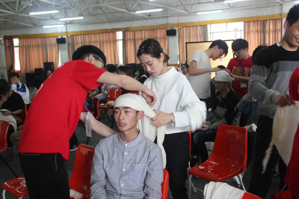 讲座主要分为两个部分,第一模块是讲述日常生活中会遇到的意外伤害以及如何应对的知识普及。第二模块是现场操作,由温州医科大的志愿者们在仔细讲解人工心肺复苏,应急止血包扎等急救技能操作知识点以后,进行现场教学,手把手教给现场观众。在示范操作以后,由观众上台模拟,同学们利用人体模型演练危机时刻,科学合理地进行评估现场安全、脉搏检查、胸外按压、人工呼吸等一系列步骤,成功实施心肺复苏;此外,还让台下的观众们组队,跟身边的队友的配合进行一系列止血包扎的方法的操作和演练。