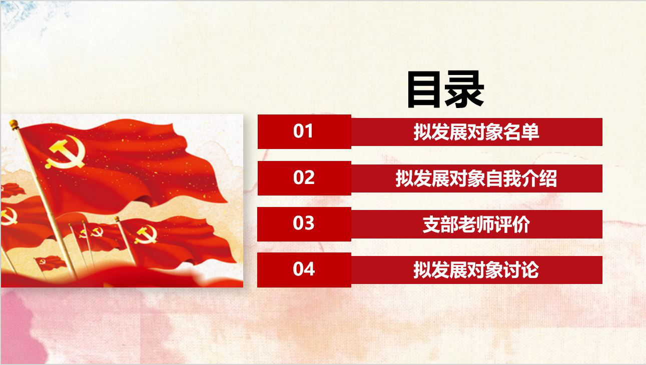 首先,参与汇报的拟发展对象从自我评价、学习经历、志愿服务、所获荣誉、入党动机、未来发展规划等几个方面阐述其在成为入党积极分子之后展现的态度和行动力。