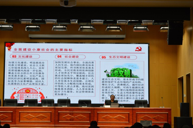 张勰老师以精准扶贫与全面建设小康社会为题,从精准扶贫的意义举措成绩、全面建成小康社会的主要指标、十三五期间哪些指标达到了小康水平,为什么说2020年全面建设小康社会等四个方面阐述了在以习近平同志为核心的党中央英明领导下,到2020年底我国已经实现全面建成小康社会的庄严承诺。