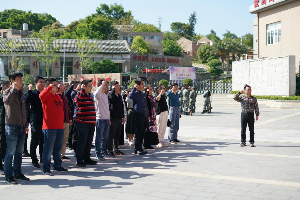 在纪念馆前的广场上,在鲜艳的党旗前,全体党员在党总支书记张勰的带领下,举起右拳,重温入党誓词,坚定理想信念。
