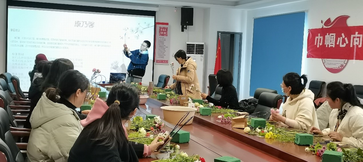 活动伊始,党员教师们观看了插花技巧的视频和图片,其中包括花材名称,插花的分类,插花时的比例、色彩、主次关系等等。大家兴趣盎然,纷纷发挥创造力,施展插花技能,小心修剪每一朵花。根据不同的色彩搭配,整合造型,一个个造型精美的花篮向上而生。老师们学习到了插花艺术相关的知识,同时也在工作之余,放松了身心、陶冶了情操,度过了一个专属于女神们的节日。