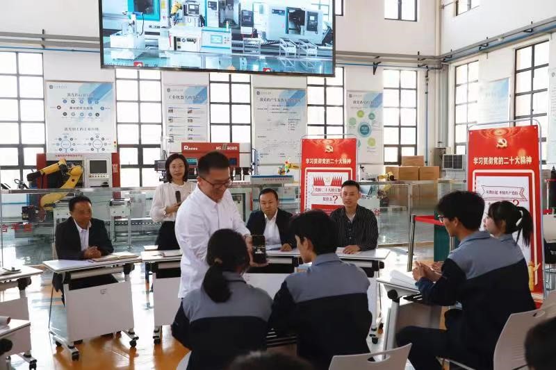 连日来,在宽敞明亮的智能制造实训场地,在实训课上课之前或者实训课结束,老师和同学利用20分钟围坐一起,集体学习党的二十大精神,重点围绕“科教兴国”战略分享畅谈作为一名职业院校教师和老员工的心得体会。